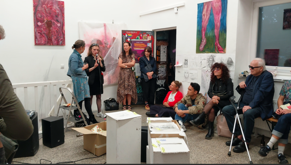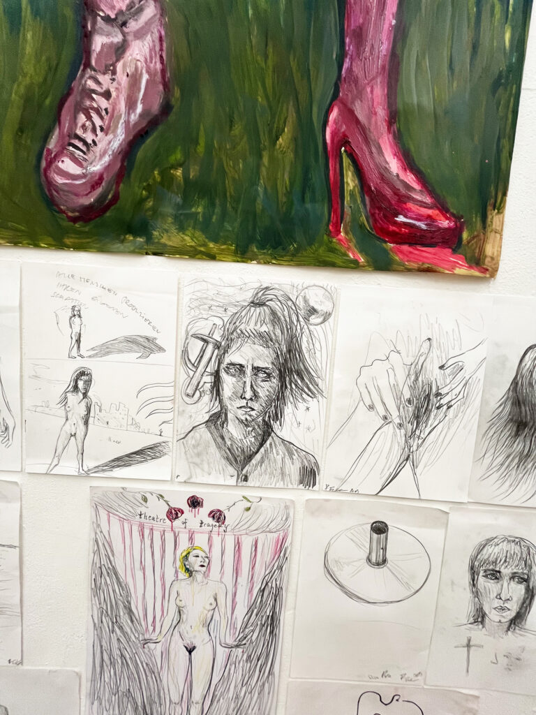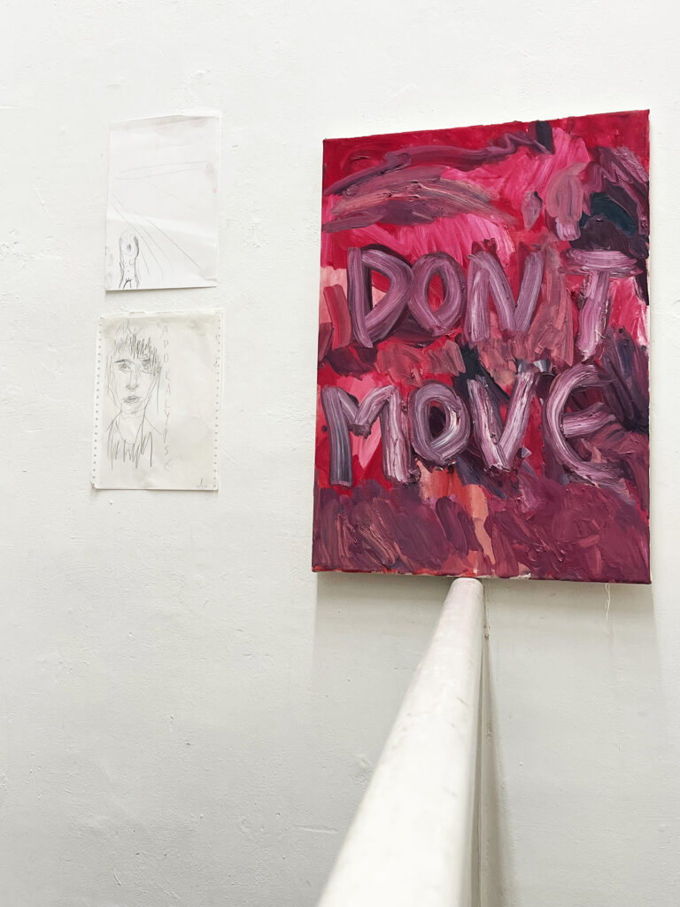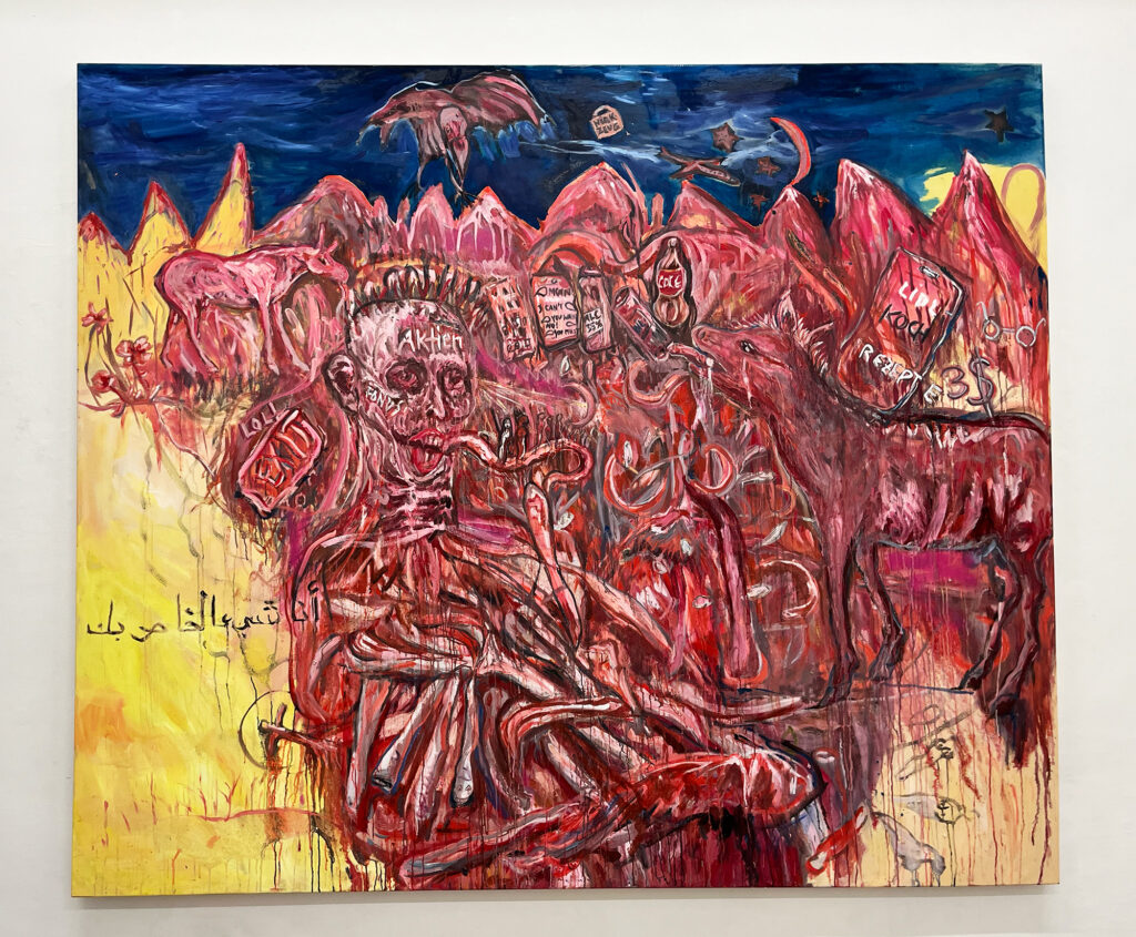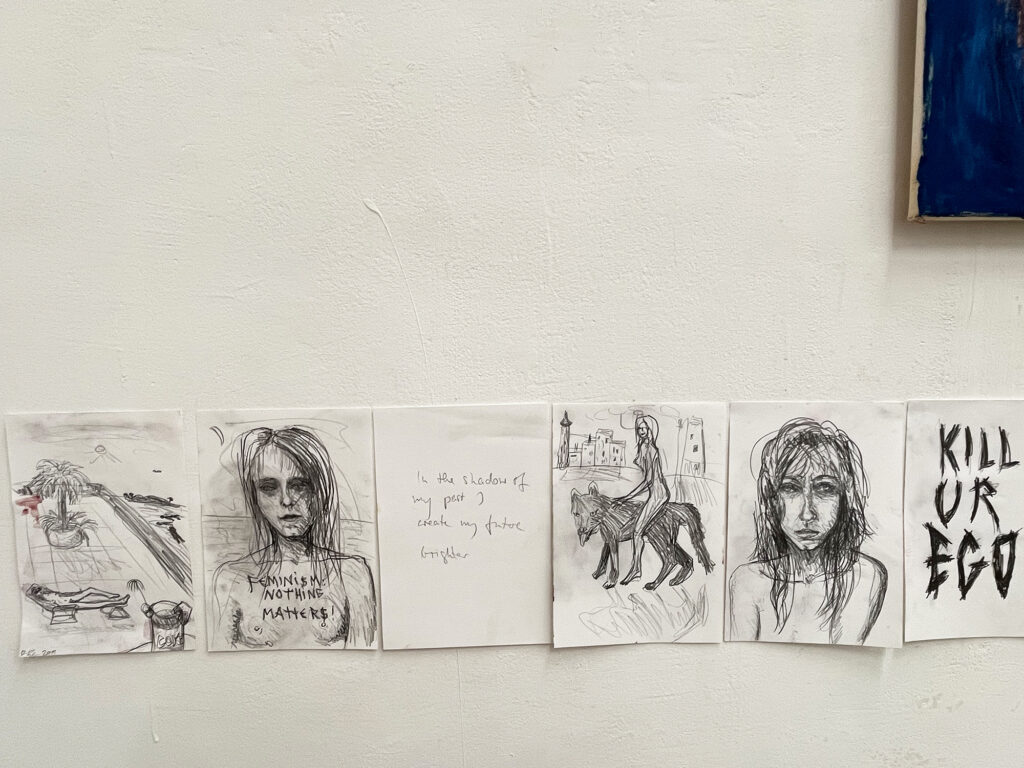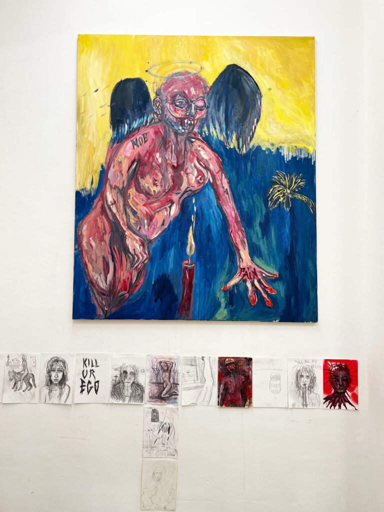 GAME OVER, Öl, Bleistift auf Leinwand, 120 x 150 cm, 2021 Foto: P. FulmenArab Spring WOMEN LIFE LOL!, 220 cm x 300 cm, Öl und Acrylspray auf Leinwand, 2024, hinterconti e. V. in der Ausstellung POISEN PROTEST PLAGIAT, 2025DON’T MOVE, 50 x 60 cm, Öl auf Leinwand, 2024, Apokalypse, 2020, SCREAM II, Bleistift auf Papier, 21 x 29,7 cm, 2022, hinterconti e. V. in der Ausstellung POISEN PROTEST PLAGIAT, 2025ANGEL ON FIRE, 150 x 180 cm, Öl auf Leinwand, 2024; diverse Zeichnungen, Bleistift, Öl auf Papier, 2020 -2024, hinterconti e. V. in der Ausstellung POISEN PROTEST PLAGIAT, 2025Diverse Zeichnungen, 2019-2024, 21 x 29,7 cm, hinterconti e. V., POISEN PROTEST PLAGIAT, 2025Ausschnitt ANGEL ON FIREWandausschnitt in hinterconti e. V., POISEN PROTEST PLAGIAT, 2025